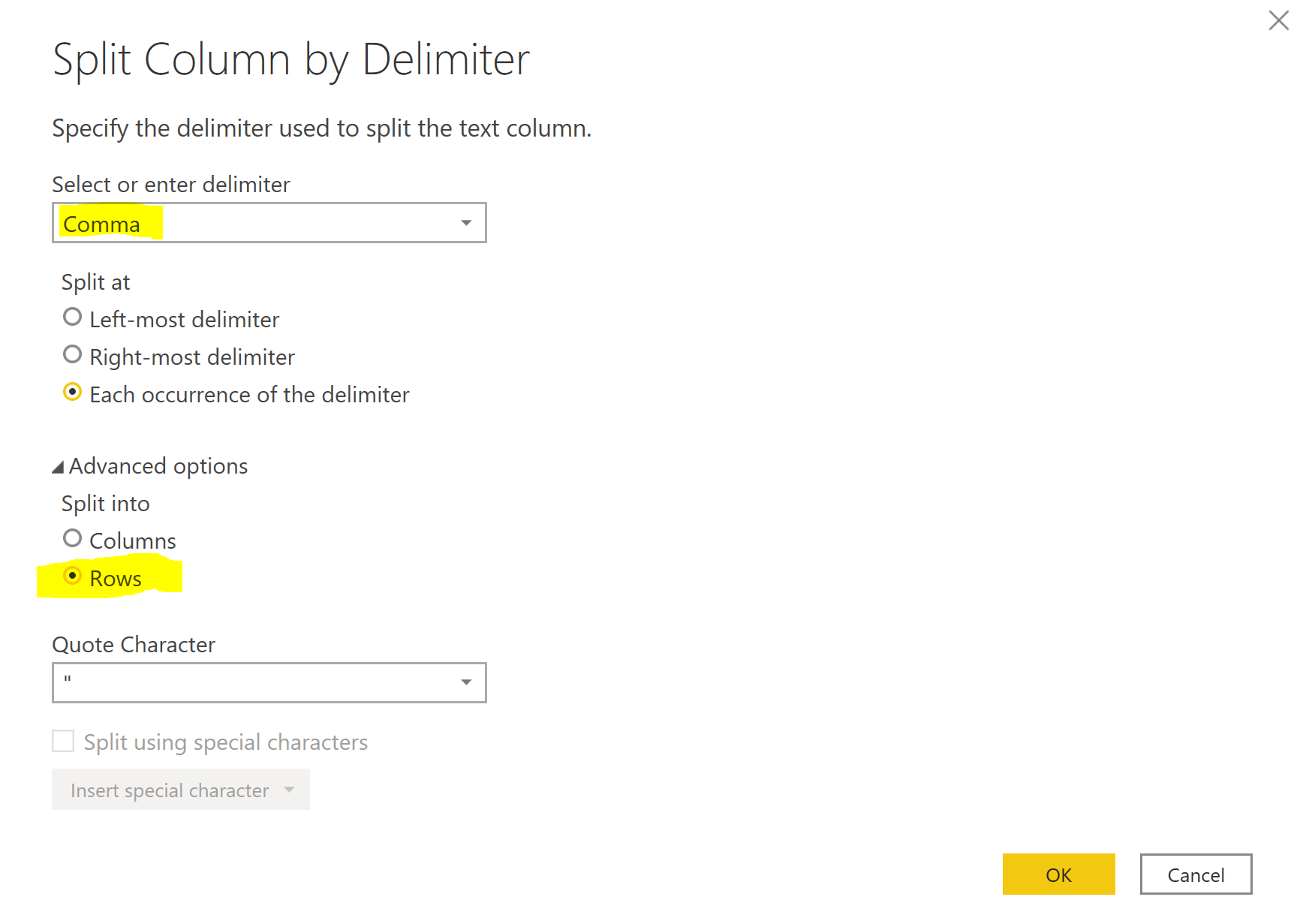 Delimiter را بر روی Comma قرار داده و split into را بر روی Rows قرار میدهیم