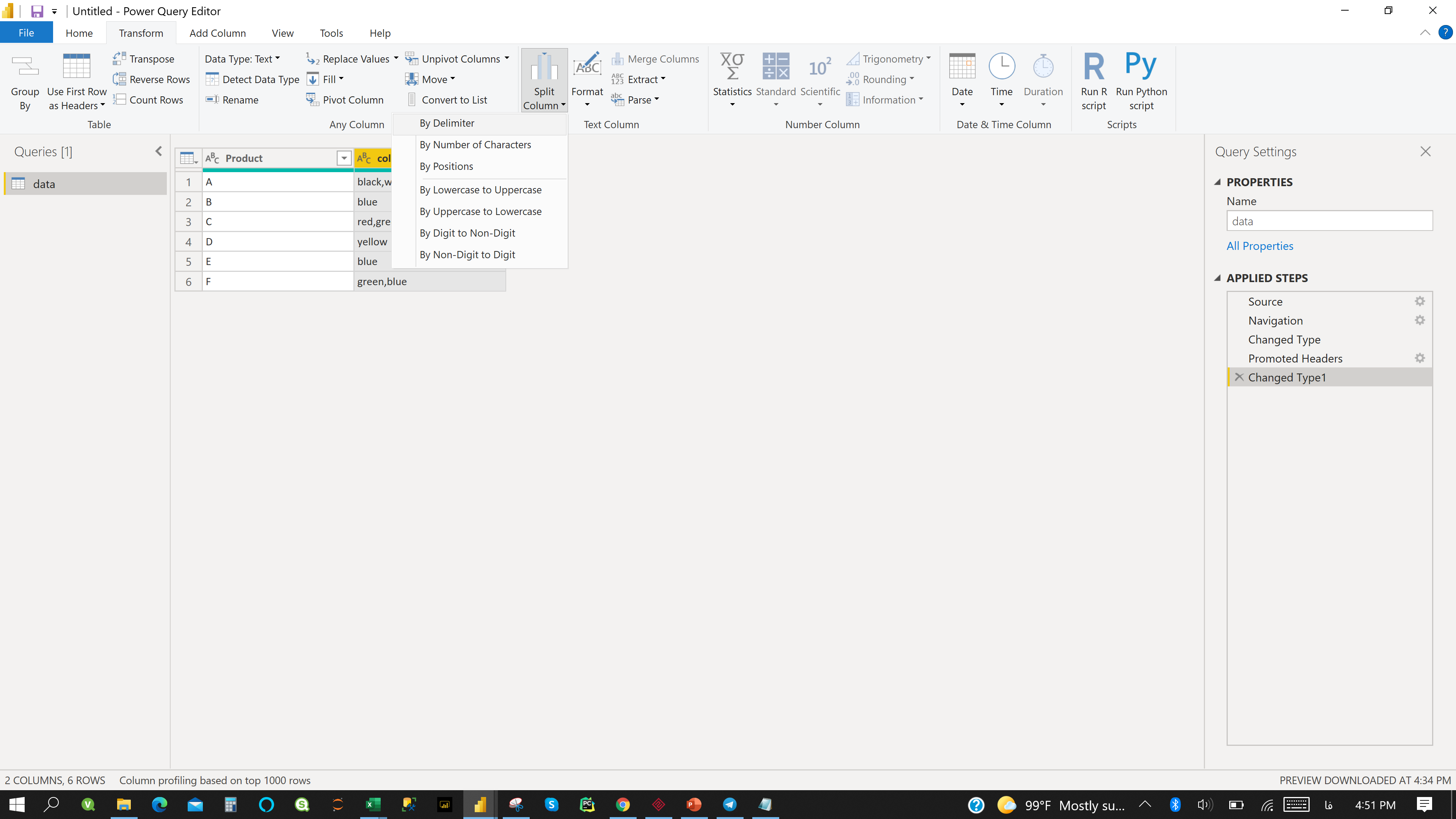 از قسمت Transform و گزینه Split column بر روی by Delimiter کلیک میکنیم(به این دلیل که رنگ ها با یک جدا کننده ، جدا شده اند).
