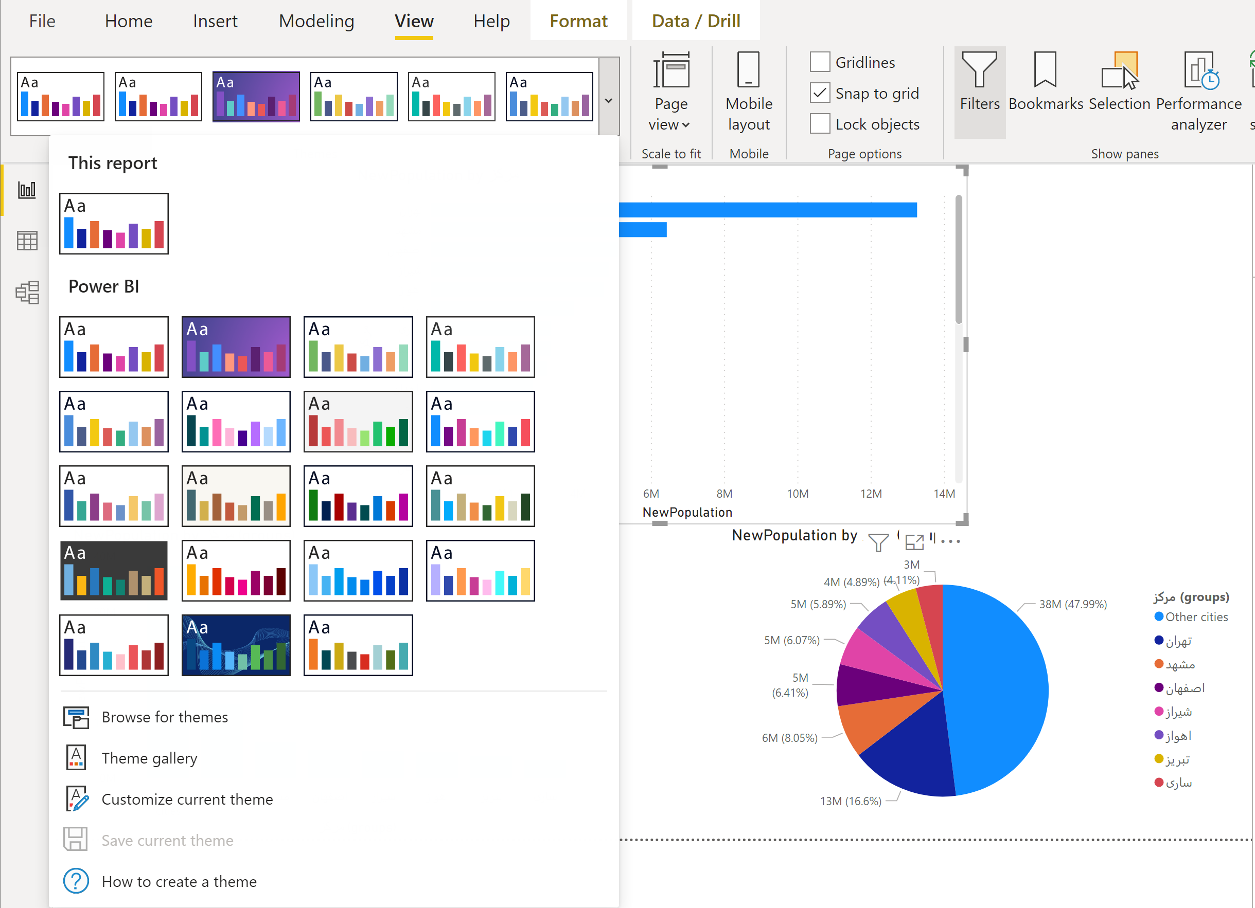 شما می‌توانید Themeهای مختلفی را برای گزارش یا داشبورد خود انتخاب کنید. برای این کار به تب View رفته و از قسمت Theme، Theme مورد نظر خود را انتخاب کنید. با انتخاب یک Theme مناسب، فونت فارسی و سایر تنظیمات ظاهری به صورت خودکار روی تمام المان‌های گزارش اعمال می‌شود.