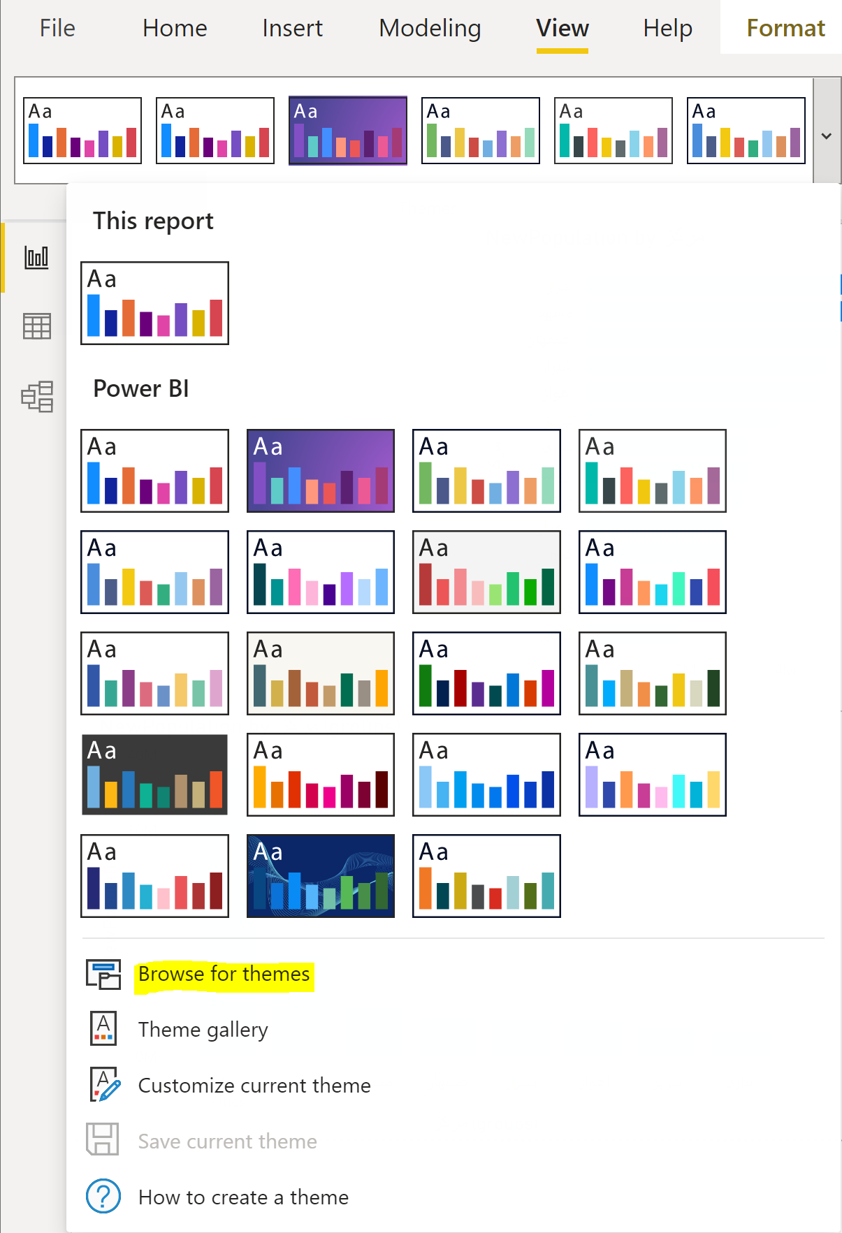 پس از دانلود، مجدداً به تب View و قسمت Theme بروید و با کلیک روی Browse for Theme، فایل JSON دانلود شده را بارگذاری کنید. با این کار، ظاهر گزارش شما تغییر کرده و فونت‌ها و رنگ‌بندی‌ها مطابق Theme انتخابی اعمال می‌شوند، و می‌توانید از فونت فارسی در Power BI برای نمایش متن‌ها و المان‌های گزارش استفاده کنید.
